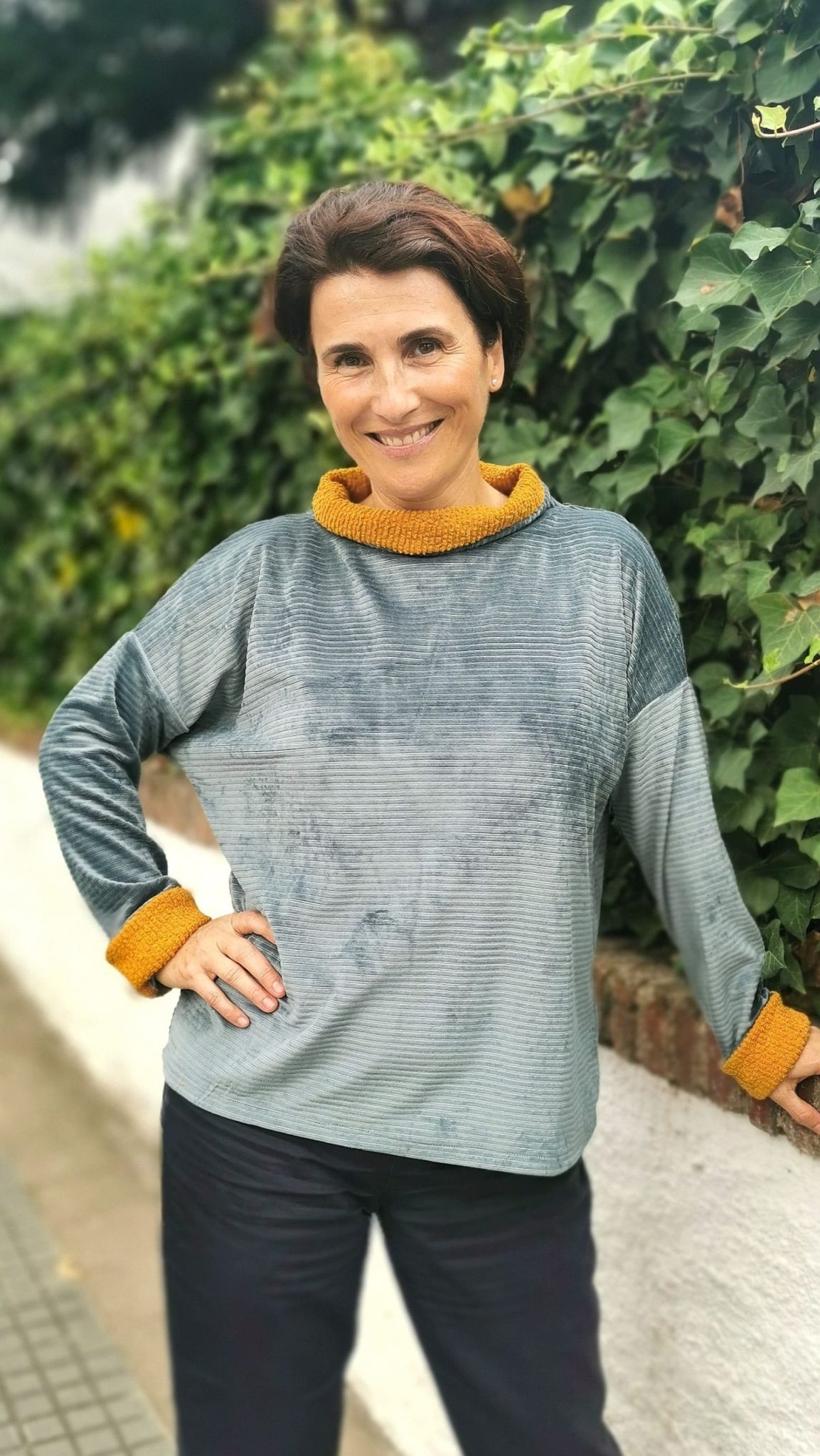 Jersey de corte ancho con mangas de murciélago y cuello en pico. Puño y bajo estampado. La cinturilla queda ajustada a la cadera, bombeando la blusa.