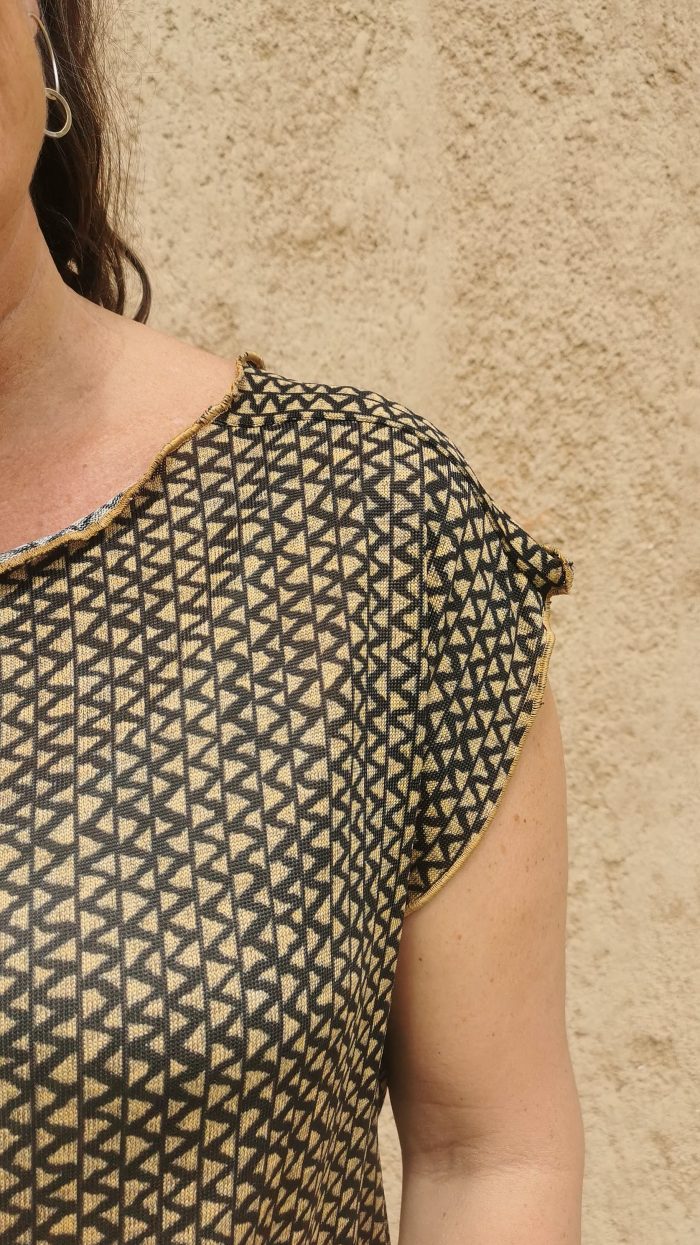 Blusa de manga corta con corte recto y cuello barco. Detalle en cuello y manga con rulito.