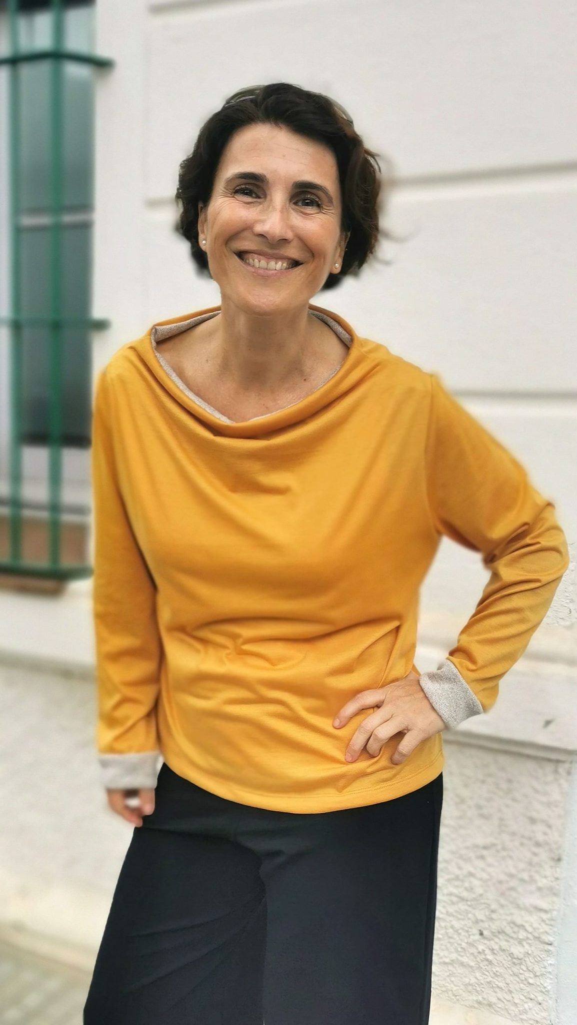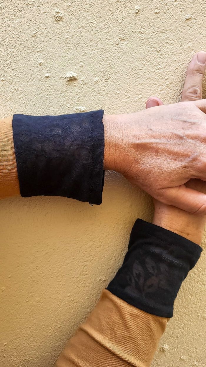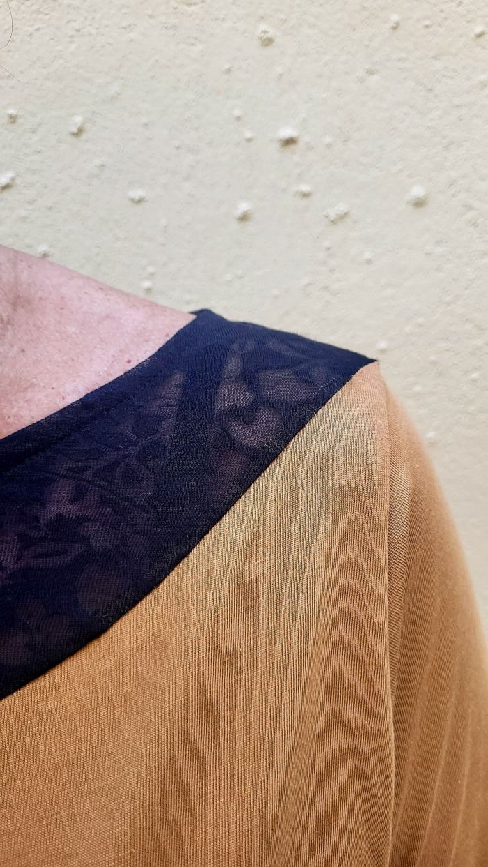 Camiseta de corte recto, cuello barca, manga larga con detalle de encaje negro en cuello y puño.