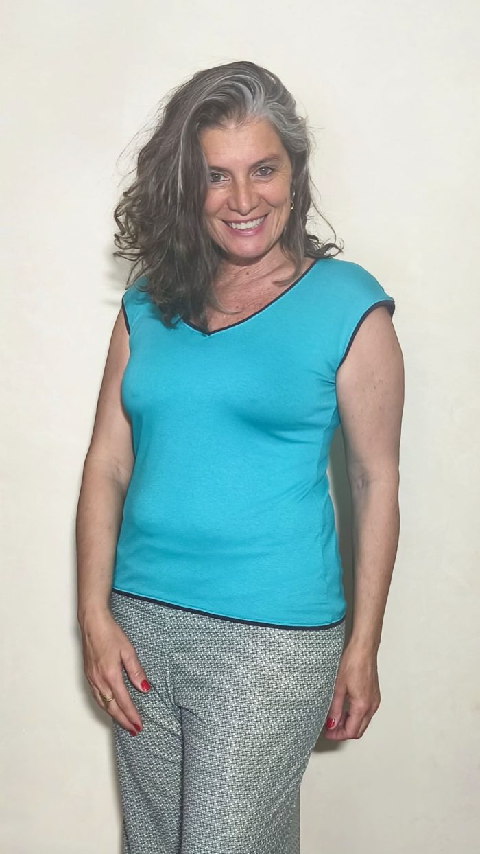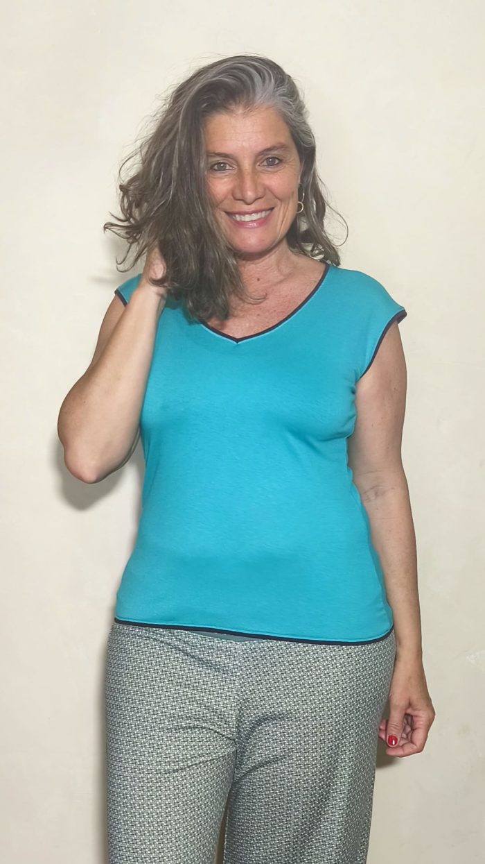 Camiseta elástica con tirante ancho cubriendo el hombro, escote en pico redondeado y vivo en bajo, manga y escote.
