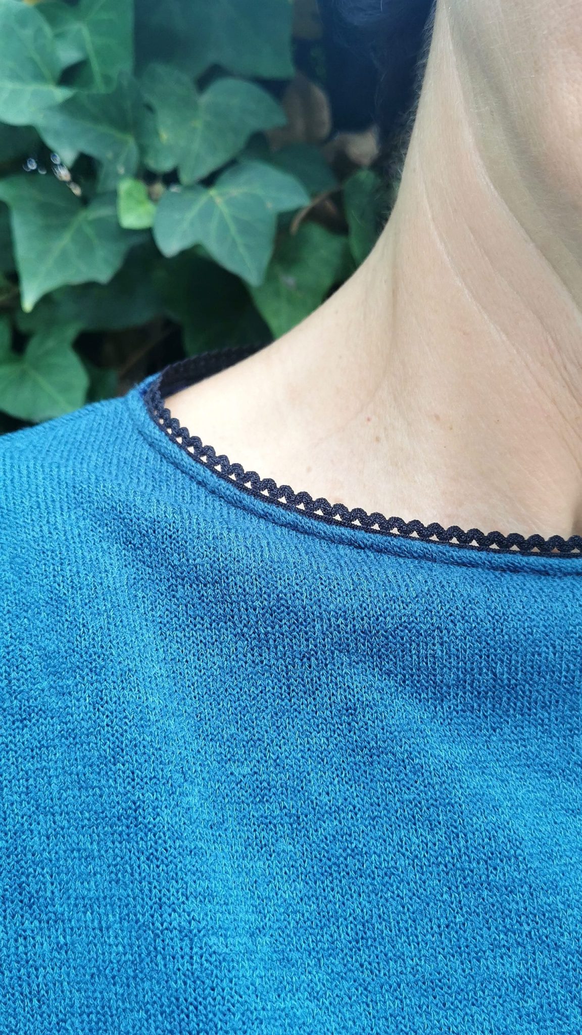 Jersey con cuello caja y doble solapa cruzada redondeada.Detalle de vivo con encaje en cuello y puño. Tejido elástico.