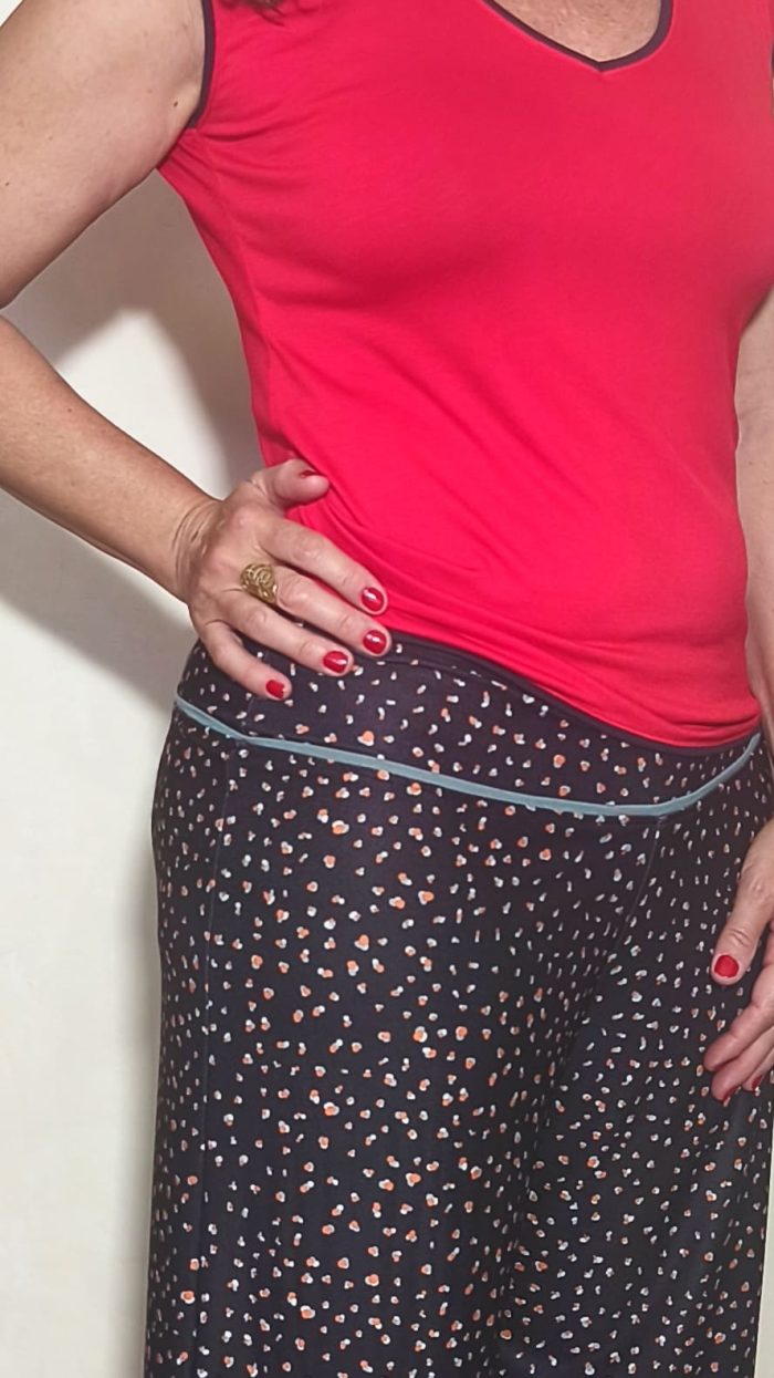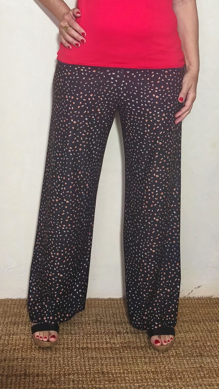 Pantalón largo tipo palazzo con cinturilla ancha elástica del mismo color que el tejido. Cómodo y con caída.