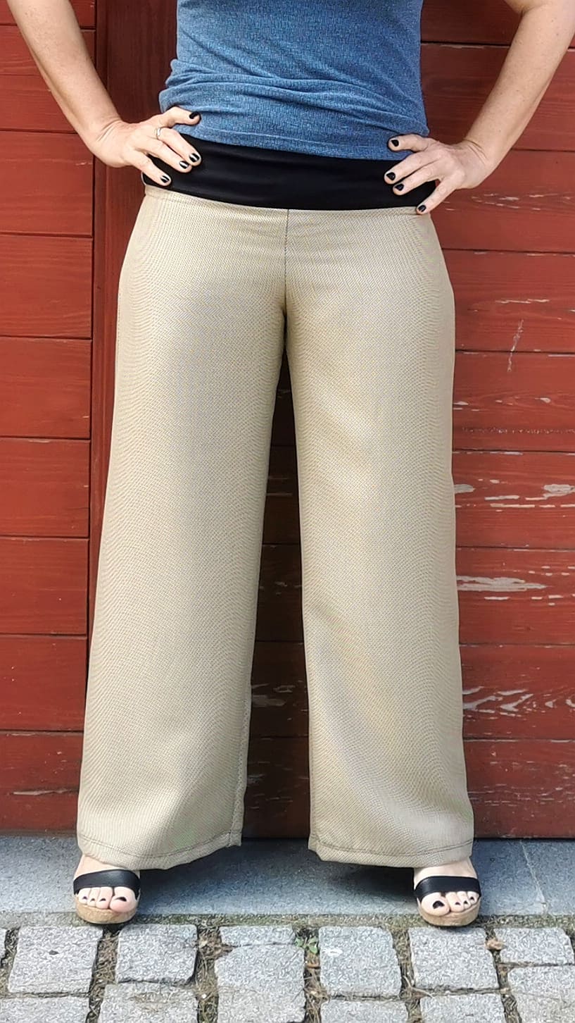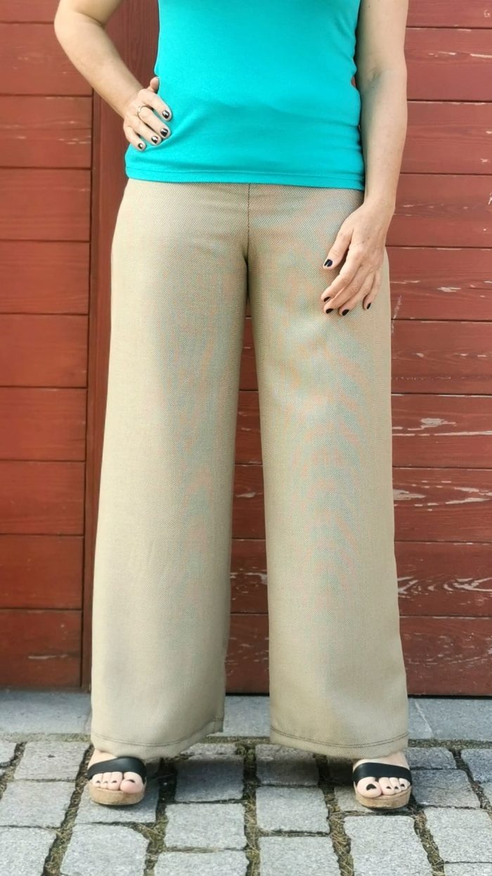Pantalón largo tipo palazzo con cinturilla ancha elástica. Cómodo y con caída.