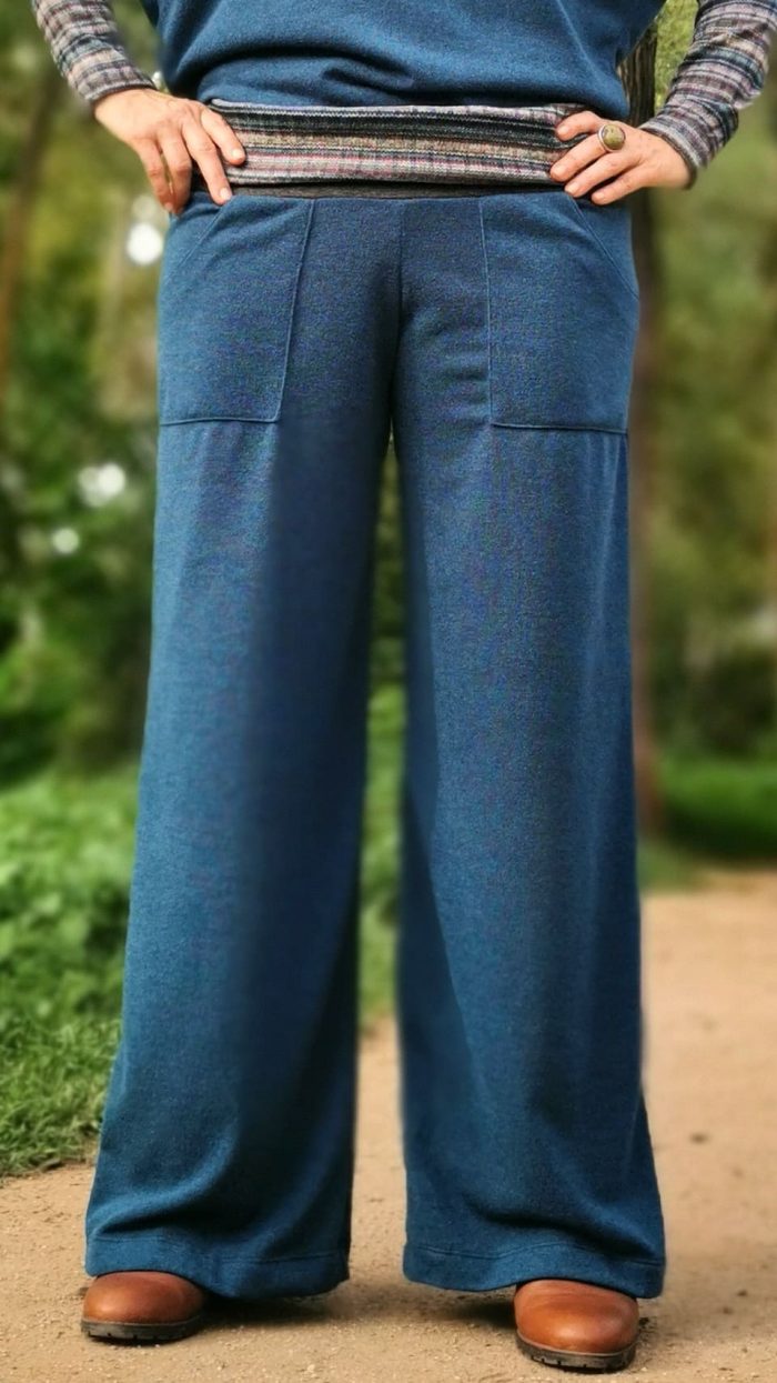 Pantalón largo tipo palazzo y con bolsillos externos. Cinturilla ancha también elástica. Cómodo y con caída.