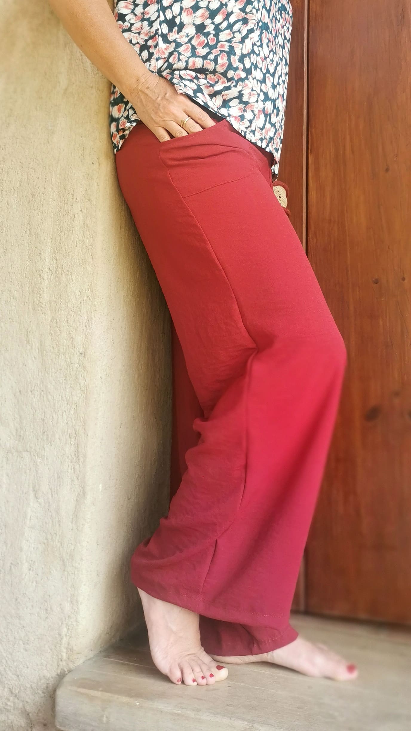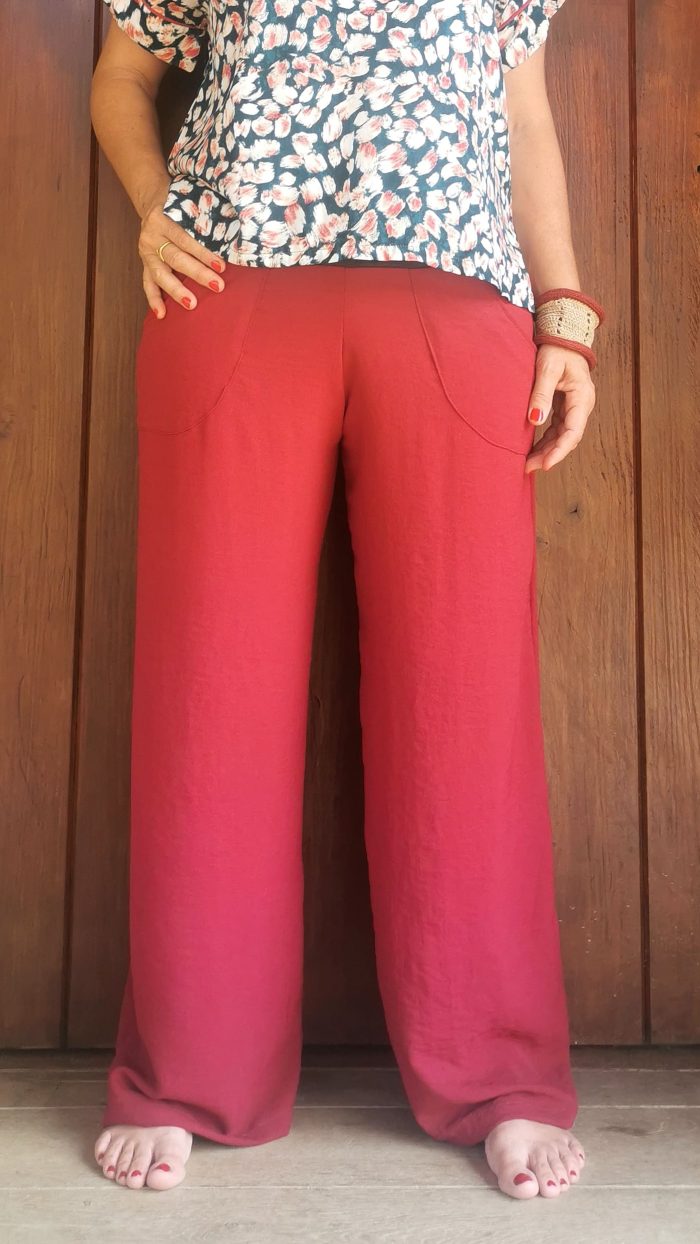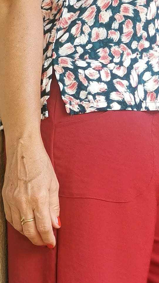 Pantalón largo tipo palazzo con bolsillos externos. Cinturilla ancha también elástica. Cómodo y con caída.