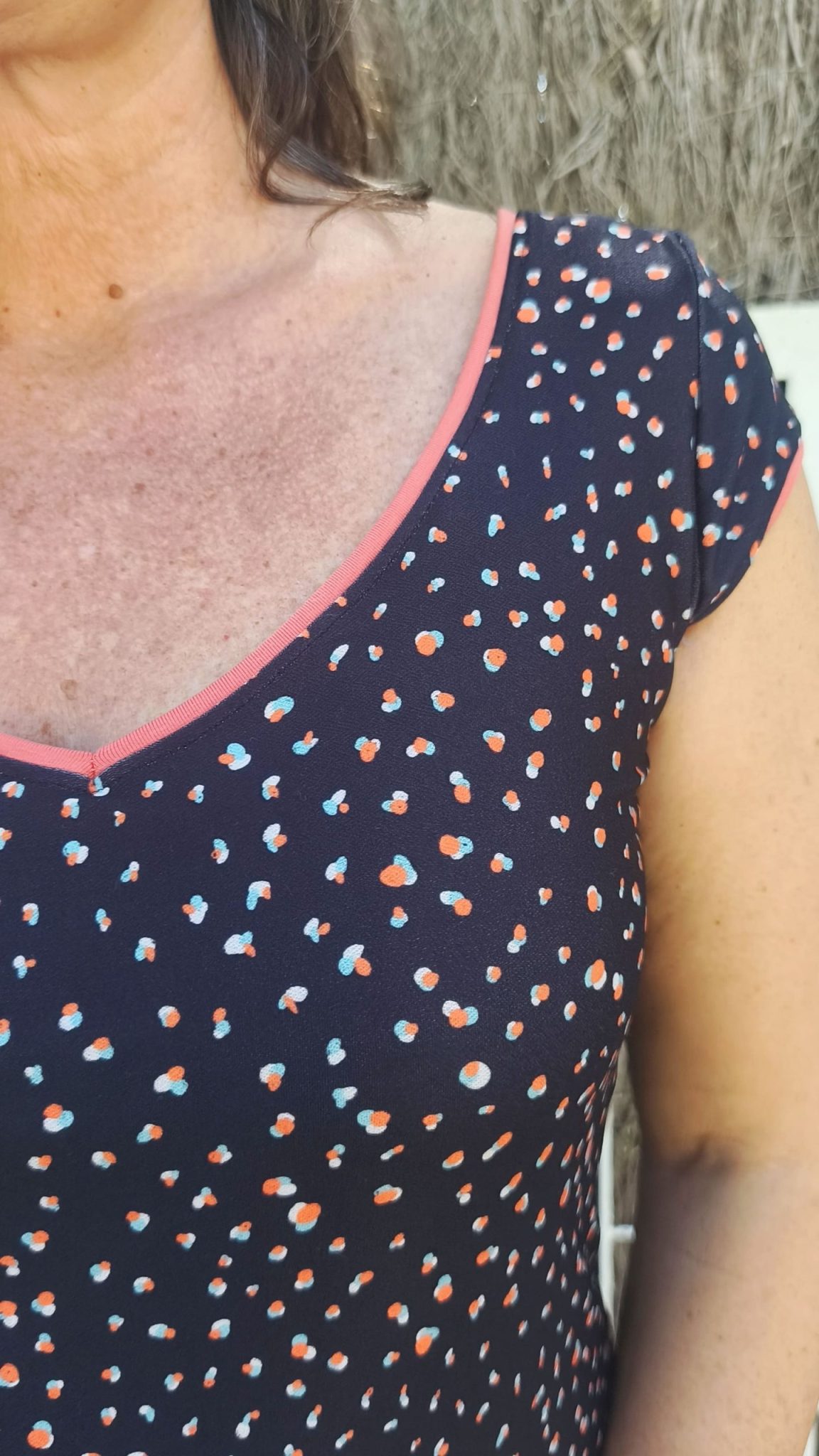 Vestido elástico con forma entallada y con un poco de evasé. Manga casquillo y escote en pico redondeado. Lleva vivo en contraste en manga.